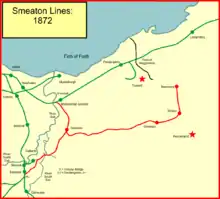 The North British Railway (Branches) Act received the Royal Assent on 3 June 1862; the lines were now described as the Monktonhall branch (from Smeaton to Monktonhall Junction); the Ormiston branch (from Smeaton to Macmerry); and the Dalkeith branch from Smeaton to Hardengreen Junction.[1][4][7] Smeaton was no more than a farmstead, but now it was to be the hub of these lines. The final part of the Ormiston branch, approaching Macmerry, ran alongside an earlier tram road that ran from Pencaitland Colliery to the coast. The Dalkeith branch included the obligation to acquire the Duke of Buccleuch's tramway, and it may be that the original intention was simply to upgrade parts of it. There was some delay before work started, possibly because of negotiations with Buccleuch and a possible redesign, but in 1865 construction started; this included a new bridge structure over the South Esk.