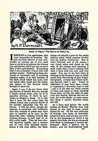 "The Statement of Randolph Carter" is a short story by American writer H. P. Lovecraft. Written in December 1919, it was first published in The Vagrant, May 1920.[2] It tells of a traumatic event in the life of Randolph Carter, a student of the occult loosely representing Lovecraft himself. It is the first story in which Carter appears. Its adaptations include the film The Unnamable II: The Statement of Randolph Carter.