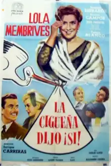 The Stork Said Yes (La cigüeña dijo ¡Sí!) is a 1955 Argentine comedy film directed by Enrique Carreras, from a script by Alejandro Casona based on a Carlos Llopis play. It stars Lola Membrives, Tomás Blanco, Esteban Serrador and Susana Campos and premiered on April 22, 1955.[1] It was the last of Lola Membrives' few incursions into cinema.[2] In 1971, Carreras remade the film based on the same play as La familia hippie, starring Palito Ortega.[3]