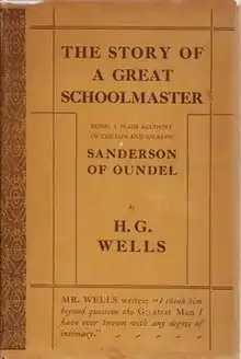 The Story of a Great Schoolmaster is a 1924 biography of Frederick William Sanderson (1857–1922) by H. G. Wells. It is the only biography Wells wrote. Sanderson was a personal friend, having met Wells in 1914 when his sons George Philip ('Gip'), born in 1901, and Frank Richard, born in 1903, became pupils at Oundle School, of which Sanderson was headmaster from 1892 to 1922. After Sanderson died, while giving a lecture at University College London, at which he was introduced by Wells, the famous author agreed to help produce a biography to raise money for the school. But in December 1922, after disagreements emerged with Sanderson's widow about his approach to the subject, Wells withdrew from the official biography (published in 1923 as Sanderson of Oundle; Wells wrote much of the text but the volume was published without listing an author[1]) and published his own work separately.[2]