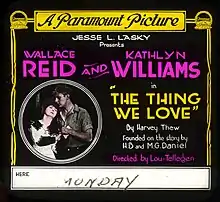 The Thing We Love is a 1918 American silent drama film starring Wallace Reid, Kathlyn Williams, and Tully Marshall, produced by Jesse Lasky, distributed by Paramount Pictures, and directed by Lou Tellegen. This marked Tellegen's second foray into directing as he usually was a leading man in front of the camera like Reid.[1][2]