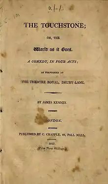 The Touchstone is an 1817 comedy play by the British writer James Kenney.[1] It premiered at the Theatre Royal, Drury Lane in London on 3 May 1817. The original cast included Charles Holland as Finesse, James William Wallack as Garnish, John Pritt Harley as Paragon, William Dowton as Probe, William Oxberry as Croply, Frances Maria Kelly as Dinah Croply, Sarah Harlowe as Mrs. Fairweather and Frances Alsop as Miss Becky. Its Irish debut was at Dublin's Crow Street Theatre on 16 February 1818.[2]