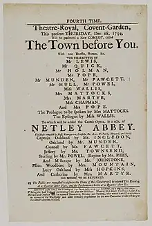 Sir Robert Floyer, Mr. Quick; sir Simon Asgill, Mr. Powell; Asgill, Mr. Pope; Conway, Mr. Holman; Fancourt, Mr. Munden; Tippy, Mr. Lewish; Acid, Mr. Bernard; Humphrey, Mr. Fawcett. Lady Horatia, Mrs. Pope; lady Charlotte, Miss Chapman; lady Elisabeth, Miss Hopkins; Georgina, Miss Wallis; Mrs. Fancourt, Mrs. Mattocks; Mrs. Clement, Mrs. Platt; Jenny, Mrs. Martyr.