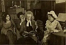 The Thanhouser production is an adaptation of only part of the novel. The film departs significantly from the original plot, such as in the omission of the double-wedding scene.[1][2] It begins with Dr Charles Primrose, the vicar of Wakefield, attending a picnic with his landlord Squire Thornhill. The vicar does not like Squire Thornhill, who is reputed to be a degenerate young man, but he has no reservations once he sees Thornhill's interest in his daughter, Olivia. The next scene shows Squire Thornhill convincing Olivia to elope with him, so the two can be married. But Squire Thornhill has no intention of marrying her, and commissions a farmer to arrange a fake wedding ceremony. The farmer accepts, but shakes his fist in anger at the squire after he has departed.[1]
