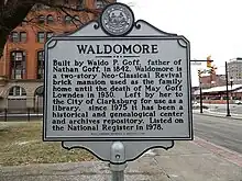Waldomore, also known as The Waldomore, is a two-story Neo-Classical brick mansion located in the Clarksburg Downtown Historic District of Clarksburg, West Virginia, United States. The building was listed on the National Register of Historic Places on October 4, 1978. The building is currently operated by the Clarksburg public library that is located in a larger building next door. Waldomore is now the repository for materials relating to the state's culture and history as well as the books and papers of notorious UFO writer Gray Barker. It also has a collection of resources for genealogical research.[2]