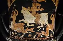 Krater (350–340 BC), believed to have been painted by Asteas (National Archaeological Museum at Paestum, Italy). Depicts Europa and Zeus, the latter in the guise of a white bull, trampling sea monsters and miscellaneous sea life.