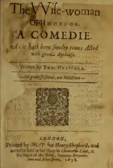 The Wise Woman of Hoxton is a city comedy by the early modern English playwright Thomas Heywood. It was published under the title The Wise-Woman of Hogsdon in 1638, though it was probably first performed c. 1604 by the Queen's Men company (of which Heywood was a shareholder), either at The Curtain or perhaps The Red Bull.[1] The play is set in Hoxton, an area that at the time was outside the boundaries of the city of London and notorious for its entertainments and recreations.[2] The Victorian critic F. G. Fleay suggested that Heywood, who was also an actor, originally played the part of Sencer.[3] It has often been compared with Ben Jonson's comic masterpiece The Alchemist (1610)—the poet T. S. Eliot, for example, argued that with this play Heywood "succeeds with something not too far below Jonson to be comparable to that master's work".[4]