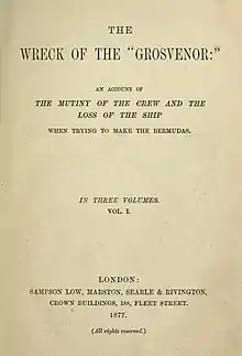 The Wreck of the Grosvenor (1877)[1] is a nautical novel by William Clark Russell first published in 3 volumes by Sampson Low. According to John Sutherland, it was "the most popular mid-Victorian melodrama of adventure and heroism at sea."[2] It remained popular and widely read in illustrated editions well into the first half of the 20th century.[3] It was Russell's best selling and most well known novel.[3] Russell noted in a preface, the novel 'found its first and best welcome in the United States.'[2]