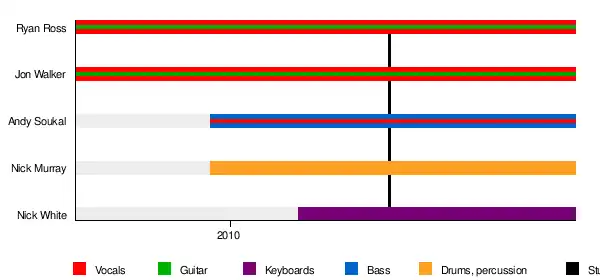 The band played their first show on March 15, 2010, at The Echo in Los Angeles, alongside artists such as Alex Greenwald, Z Berg, Jenny Lewis, and Edward Sharpe.[10] In May of that year, it was announced that the band would begin playing their first tour on June 11, debuting members Nick Murray on drums, Andy Soukal on bass and Nick White on keyboards.[11]