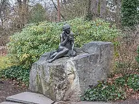 The most celebrated statue of this subject is the bronze figure that the Russian artist Pavel Sokolov (1765–1831) made for the pleasure grounds planned by Tsar Nicholas I of Russia at his palace of Tsarskoye Selo.[27] It shows the seated milkmaid weeping over her broken pot, which has been converted into a water feature by a channeled feed from a nearby spring. Originally it was called "Girl with a pitcher", but it became so celebrated that it is now better known as "The Milkmaid of Tsarskoye Selo". There is only a copy there today in what has become a public park, while the original is preserved in a St Petersburg museum.[28] In fact several other copies have been made over the years. One was given by the wife of Nicholas I, the princess Charlotte of Prussia, as a birthday gift to her brother Karl in 1827. This was placed in the grounds of his Glienicke Palace near Berlin but was eventually destroyed during World War II; it is now replaced by a modern copy and is known as Die Milchfrau.[29] Yet another was erected in the public park of Schloss Britz in 1998, and still another at Soukhanovo, near Moscow.