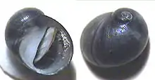 | Two views of a shell of Theodoxus meridionalis; the left view has the operculum in place in a partially open position | |