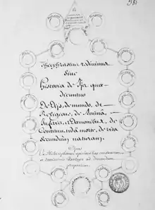 The manuscript shares its title with another, printed book also titled Theophrastus redivivus, which was published in Frankfurt by an Elias Johann Hessling in 1659.[6] The 1659 book, written in German and defending the Swiss German Renaissance scientist and occultist Paracelsus, has no connection to the anonymous work. It is unknown which work predates the other, and why the two books share the same title; neither work mentions the other.[6] However, Latin book titles with a personal name from classical antiquity followed by "redivivus" were somewhat common in the 17th and 18th century.