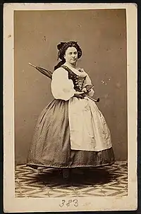 There she attracted attention by her lively character, and already after one year of activity, she was chosen by director Johann Hoffmann for the State Opera in Prague. She appeared on June 3 in Das Versprechen hinterm Herd[2] and in Family Fliedermüller and struck with her strongly parodistic coarseness, her almost trivial, but fresh and powerful playing. Her engagement was regarded as the event of 1851 in the field of the burlesque under Hoffmann's direction and as the greatest act during his last years as director in Prague. When Stöger took over the direction, he was first and foremost concerned with preserving this Austrian local singer, who was already excellent at that time, for his institute. The time of her Prague artistic activity (1851 to 1855) remained unforgotten for a long time.