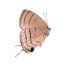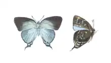 Like Arcas, they have androconia (scent scales) on the hindwing upperside near the base of the cubital vein; these are autapomorphically tucked away in a flat deep pouch in space 1b between the wing veins. Some species also have androconia on the forewings, but it needs to be clarified whether these are indeed Theritas sensu stricto. The hindwing underside is brownish in these butterflies, with a subbasal line running between the subcosta and the anal vein branch of the cubital vein. This genus has some sexual dichromatism in that the males show green iridescence of the blue upperwing color. By comparison, Arcas has golden-green hindwing undersides dusted with black, with a black band running roughly parallel to the distal wing margin, longer tails, and lacks sexual dichromatism. The female genitals have a long, straight and tubular genital duct with a plain anal end in the type species T. mavors, but variation within the genus is insufficiently studied.[3]