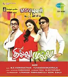 Yuvan Shankar Raja and M. S. Viswanathan, the composer of the original Thillu Mullu joined hands for the first time in Thillu Mullu and handled the music for the cult film's remake together.[6] Two songs from the original — ‘Thillu Mullu’ (remix) and ‘Ragangal Pathinaaru’ — have been retained, and two fresh songs composed. About the remix, Yuvan said, "I just wanted to give the original theme music a contemporary sound. I have not touched the song ‘Ragangal Pathinaaru’, which has been sung by singer Karthik."[13] While M. S. Viswanathan composed the tunes, Yuvan Shankar Raja orchestrated and recorded them.[9] The audio launch was held on 1 June at the Victoria Hall in Geneva, Switzerland along with the audios of Nalanum Nandhiniyum and Sutta Kadhai.[19]
