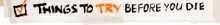 Things To Try Before You Die (sometimes shortened to Things To Try) was an Australian travel show that was produced by and aired on the Nine Network. Making its debut on 17 July 2007, each episode of the show focused on a particular country and counted down the top 30 things that one 'must try' in that country.