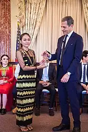 In 2016, Thinzar Shunlei Yi won one of ten Emerging Young Leader Award from the US Department of State for her organization of the ASEAN Youth Forum and International Youth Day celebrations, along with her mental health activism.[19][33][34][11] Three years later, she won in the Media & Communications category of the Women of the Future Awards Southeast Asia.[35][22] That same year, she became an inaugural Obama Foundation Leader for Asia Pacific.[22][36] Post coup d'état, she was awarded a Magnitsky Human Rights Award for Outstanding Young Activist for her advocacy for internally displaced persons in Kachin State, her organization of peace marches on the International Day of Peace, and her establishment of the #Sisters2Sisters campaign.[22][33]