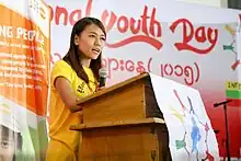 She first became politically active in 2012,[15] when she helped organize International Day of Peace[16] and attended a youth forum in Cambodia.[17] She eventually became the first female national coordinator for the National Youth Congress, and the president of the Yangon Youth Network, serving two terms.[18] In 2014, she co-organized the ASEAN Youth Forum, and a International Youth Day celebration, which focused on mental health awareness.[19] During this time, she was frequently harassed online, and her phone number was leaked on pornographic sites.[20][21] She stopped organizing youth forums in 2016, and began working with the NGO coalition Action Committee for Democracy Development, becoming an advocacy coordinator.[18][22]