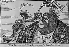 In an attempt to dislodge the Fusionist coalition from North Carolina's government in the elections of 1898, the Democratic Party engaged in a white supremacist campaign which decried "Negro domination".[11] Democratic newspapers criticized Russell for giving blacks guns, accused him of making the officers' appointments due to political rather than military considerations, and stated that he doted on his "pet regiment" with favoritism.[11] Josephus Daniels, editor of the Raleigh News & Observer, conceded that Young was an "intelligent Raleigh mulatto" but decried him and his men as "Russel's birds of prey."[2] Daniels singled out Young for criticism, accusing him of sabotaging efforts to deploy the regiment to Cuba for garrison duty so that he could remain within traveling distance of Raleigh to attend to political affairs.[16] North Carolina Adjutant-General Andrew D. Cowles, a Republican, also stated in an interview that news of the heavy casualties at the Siege of Santiago had led a significant amount of the regiment's initial volunteers to back out of their enlistment due to "downright cowardice."[11] Black leaders rebuked his statement by pointing out that the army's regular black units had fought during the battle and highlighting the struggle to find enough white volunteers in the state.[17]