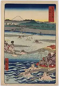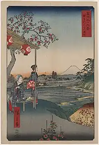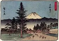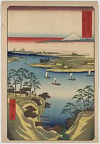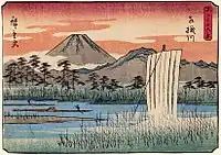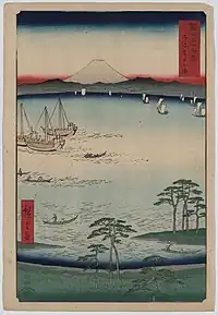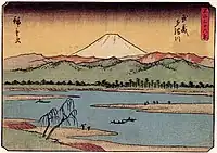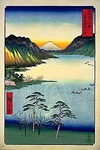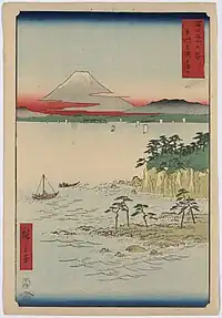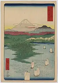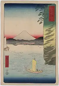 Thirty-six Views of Mount Fuji (Japanese: 富士三十六景, Hepburn: Fuji Sanjū-Rokkei) is the title of two series of woodblock prints by Japanese ukiyo-e artist Hiroshige, depicting Mount Fuji in differing seasons and weather conditions from a variety of different places and distances. The 1852 series, published by Sanoya Kihei, are in landscape orientation using the chūban format, while the 1858 series are in the portrait ōban format and were published by Tsutaya Kichizō.[1][2] The same subject had previously been dealt with by Hokusai in two of his own series, Thirty-six Views of Mount Fuji, produced from c. 1830 to 1832,[3] and One Hundred Views of Mount Fuji, published in three volumes from 1834 to 1849.[4]