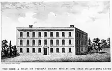 Brand Hollis resided at The Hyde, a country house in Essex bought by his father in 1718, and improved for him in 1761 by William Chambers.[7][8] In July 1786, he entertained there his friend John Adams, the first American ambassador to the Court of St. James's. Adams stayed for several days, as recorded in his memoirs.[9][10]