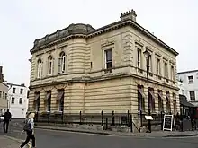 in Italianate style, dated 1870 above the public entrance door ... Postlip stone ashlar over brick, with Portland, Polyphant and Doulting stone dressings, and brick to the rear; the building has a slate roof and tall lateral stack, with cornice and acroteria off-centre left, and iron railings and gates with ashlar end pier.[82]