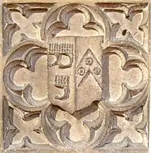 Heraldic escutcheon within quatrefoil on Grenville's monument in St Mary's Church, Bideford. Arms displayed are: Gules, three clarions or (Grenville) impaling Or, on a chevron sable three roses of the field (Gilbert)[7]