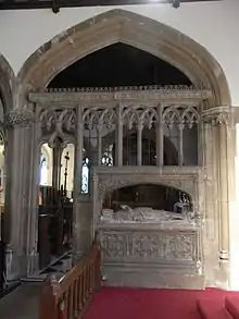 His recumbent effigy is shown fully armed in a suit of Almain rivets and his feet rest on a dog. His hair is of chin-length and his hands are clasped in prayer holding a ball shaped object, his heart according to Roger Granville, Rector of Bideford and the family's historian, who described the monument in detail in 1895.[1]