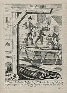 Thomas Holland is quartered at Tyburn. Matthias Tanner, Societas Jesu usque ad sanguinis et vitae profusionem militans, Prague, 1675.