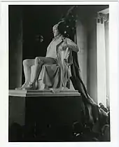 The centerpiece of the memorial was to be a monumental statue of Jefferson. Bitter had already modeled his seated Jefferson for Cleveland, and the committee commissioned him to create a marble version 50 percent larger than the original. The Cleveland statue depicted a 33-year-old Jefferson, his age at the time of the writing of the Declaration of Independence. The St. Louis statue was to depict a 60-year-old President of the United States, his age at the time of the Louisiana Purchase.[10] The statue was roughed out of a forty-five ton block of white marble in Italy, and shipped to St. Louis, where Bitter did the finished carving in situ.[11] The completed statue was unveiled on April 13, 1913, Jefferson's 170th birthday.[2]