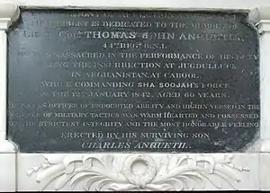 Brigadier General Thomas John Anquetil (1784 – 12 January 1842) was an officer of the British Indian Army who was the last senior officer to command the ill-fated Army of the Indus force as it retreated from Kabul in the First Anglo-Afghan War in 1842.[1] His superiors during the campaign were Generals Sir William Elphinstone and John Shelton. Elphinstone and Shelton were captured and interned by the Afghan rebels, Anquetil on the other hand would die fighting with his force in the mountain passes between Kabul and Jalalabad.[2][3] The British Army and East India Company would lose 4,500 men (mainly Indian soldiers) and 12,000 civilians (mainly Indian), massacred by Afghan tribesmen loyal to the rebel leader Wazir Akbar Khan. Anquetil was said to have died ‘fighting hand to hand with the enemy’ near Jugdulluk, close to the Kabul pass.