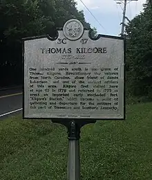 Thomas Kilgore was born in 1715 in present-day Virginia. Kilgore served in the American Revolutionary War, and many have claimed that he fought in the Battle of Kings Mountain. However historians have disputed this claim, saying that Kilgore served as the Quartermaster for the Commission surveying the District for North Carolina Revolutionary War soldiers.[1]