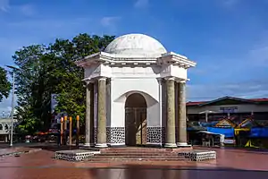 The Thomas Parr Monument is octagonal in shape, covering a total area of 70 square metres (750 sq ft). Three arched openings provide entrance, and six Tuscan or Roman Doric columns surround the monument. The 13.5-metre (44 ft) monument is topped with a dome.[4][3] Owing to this dome, the mausoleum is also known locally as "Kuburan Bulek" ('Round Grave').[3]