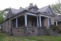 The southern elevation includes the rest of the wrap-around porch and a protruding three-sided gable-roof topped bay.[4] There is one double-hung window on the porch facing south; it features a leaded glass pane over a single pane. A door with two large frames of glass is set in the bay opening onto the porch.[4] A double-hung, one-over-one window is set in the southern and southeastern sides of the bay; two more double-hung, one-over-one windows, featuring single leaded-glass panes, are set in the wall west of the bay.[4]