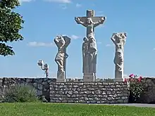 Resetarits worked mostly in stone, wood, and bronze.[2] From 1970, he received many commissions from the Diocese of Eisenstadt to design altars, altar areas, and Stations of the Cross.[2] From 1974 to 1976, he also worked as an instructor in a prison in Eisenstadt.[2] He created Kontakt, a tall bronze sculpture, for a panoramic rest area near Bernstein on the Burgenland Straße (B 50) in 1987. In addition, he designed stained glass windows from 1990, received commissions for public spaces, and worked as a book illustrator.[1]
