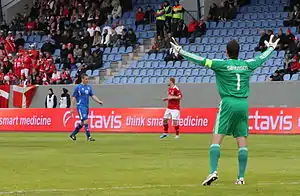 He continued to be Stoke's first choice goalkeeper in 2009–10 and signed a contract extension in November 2009, to keep him at the Britannia Stadium until 2011.[23] During the 2009–10 season he continued his good form in goal. He saved penalties during games against Portsmouth,[24] Arsenal[25] and Wigan Athletic,[26] and played an important part in Stoke's good run in the league, which brought them to 10th place in December.[27] On 12 December Sørensen saved yet another penalty, meaning he had by then saved five out of the last six penalty kicks against him.[28] Sørensen got extra competition for the spot as Stoke's first-choice goalkeeper, following the signing of Asmir Begović from Portsmouth in February 2010.[29] He dislocated his elbow in a game against Chelsea on 25 April.[30] The elbow was put back in place without the need for surgery, but Sørensen missed the last three games of the 2009–10 season.