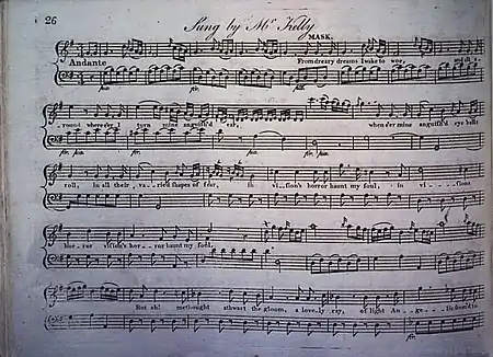 - ↑ Kelly, Michael. Reminiscences of Michael Kelly of the King's Theatre and Theatre Royal Drury Lane, Including a Period of Nearly Half a Century with Original Anecdotes of Many Distinguished Persons, Political, Literary, and Musical, Volume 1. London: Henry Colburn, New Burlington Street (1826). pp. 289-291.