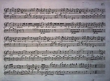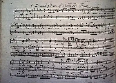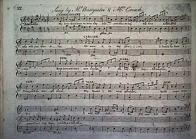Part of the music (including the overture, some arias, duets and choruses) was composed by Shaw himself. However, in his dedication inside the published vocal score of 1789, Shaw advises that the librettist St John actually selected some other pieces of music, which probably include the opening chorus "Welcome all who sigh with Truth" whose music is borrowed from Geminiani[33] and the Act I finale ("My love, from hour to hour", duet between the Commandant and Carline) borrowed from Mozart's Le nozze di Figaro (Act III opening duet "Crudel! perché finora" between the Count and Susanna).[21] The latter, according to Robert Fiske, had just been published in London.[6]