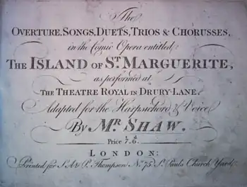 - 1 2 Shaw, Thomas (1789). The Overture, Songs, Duets, Trios & Chorusses in the Comic Opera entitled The Island of St Marguerite, [the words written and the music partly selected by the Hon. J. St. John] ... adapted for the Harpsichord & Voice by Mr. Shaw. London: S. A.&P. Thompson. The British Library: Music Collections DRT Digital Store D.282.(8.).