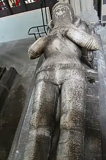 He was killed on 21 July 1403, fighting at the Battle of Shrewsbury for the Lancastrian cause and was buried in Bakewell Church, Derbyshire (where he may have been a member of a guild within the church), 5 miles north-west of Wensley, where survives his effigy, dressed in full armour and wearing around his neck the Collar of Esses of the Lancastrian livery.[4] His helmet is inscribed IHC Nazaren ("Jesus of Nazareth").