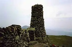 The grassy top is crossed by a stone wall which rises up from Threshwaite Mouth and then peters out a few hundred yards to the east of the summit. A section of old fenceposts then continues the boundary line toward High Street before again being replaced by stone wall. The actual top is marked by one of the most impressive columnar cairns in the district. Named Thornthwaite Beacon, it towers 14 feet (4.3 m) above an angle in the wall.[1]