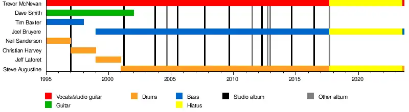 Thousand Foot Krutch (often abbreviated TFK) is a Canadian Christian rock band formed in Peterborough, Ontario, in 1995.[5][6] The band has released ten studio albums, two live albums, and three remix albums. The core members consist of founding member Trevor McNevan (vocals, guitar), Steve Augustine (drums), and Joel Bruyere (bass, backing vocals).