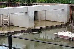 The weir has been constructed across the Three Mills Wall River (also known as Shortwall) by British Waterways.[8] In conjunction with Three Mills Lock and sluice, the two structures stabilise levels at 7.5 feet (2.3 m) above ordnance datum (AOD) around the Queen Elizabeth Olympic Park, whereas they used to rise to 15.8 feet (4.8 m) AOD previously.[6] The structures came into operation in 2009.[9][10]