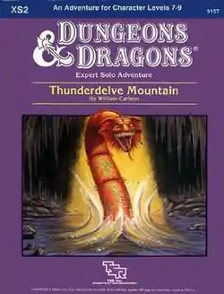 Thunderdelve Mountain is a solo adventure scenario for a dwarf player character who must defeat a monster alone.[1] The module also instructions for running the adventure with a full party of characters instead.[1]