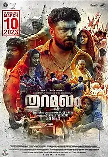 Thuramukham (transl. Harbour) is a 2023 Indian Malayalam-language period drama film directed and filmed by Rajeev Ravi and written by Gopan Chidambaran. It is based on the play of the same name by K. M. Chidambaran, Ravi's father.[3][4][5] The film stars Nivin Pauly, Indrajith Sukumaran, Joju George, Arjun Ashokan, Sudev Nair, Manikandan R. Achari, Senthil Krishna, Nimisha Sajayan, Poornima Indrajith and Darshana Rajendran in prominent roles. In the film, the harbor workers protest against the Chappa labor allocation system practiced during the 1940s and 50s in Cochin district of Kerala.