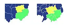 Comparison of the boundaries of (on the left) the Catholic parishes of Thurles (yellow) and Moycarkey-Borris (green) with those (on the right) of the civil parishes in the area