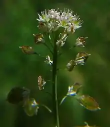 Thysanocarpus is a small genus of plants in the family Brassicaceae known generally as fringepods[1] or lacepods. These are small, erect annual herbs. The flat fruit capsule is generally round or oval-shaped with a wing that goes all the way around the pod, giving it a fringed look. The fruits hang from most of the length of the stem. The plants are native to the western United States.