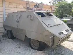 The Palestine Liberation Organization (PLO) guerrilla factions based in Lebanon assembled at their workshops in the Palestinian refugee camps of West Beirut some eight armoured cars which differed little from the original UR-416 design. Minor details could be found in the positioning of the headlights, which were bolted to the side of the engine compartment and protected by a box-shaped brush guard, instead of being mounted on top as per in the West German model.[3] They were first displayed publicly at a PLO parade held at Beirut in April 1981, some of them fitted with roof-top AT-3 Sagger or ENTAC anti-tank missile systems[4] though period photos show that they were more often armed with a single Browning M1919A4 .30 caliber (7.62mm) or M2HB .50 Browning (12.7×99mm) heavy machine guns mounted in the roof.[5]