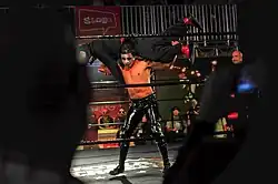 In mid-2006 Santos began working for Lucha Libre AAA World Wide (AAA), one of Mexico's two largest wrestling companies. In AAA he was given a new ring name and look, as he was turned into "Mini Charly Manson", a Mascota version of Charly Manson, complete with facepaint, wrestling outfit and entrance music.[1] Initially he worked as a Rudo (bad guy) teaming up with other Mascota variations of Charly Manson's allies such as Mini Cuervo. His first storyline feud was against Mascarita Divina, a técnico (good guy) Mini-Estrella who happened to be Santos' cousin, although that fact was not revealed to the general audience. He worked storylines against Mascarita Sagrada and Octagoncito that people predicted would end in a Lucha de Apuesta, or bet matches, between the wrestlers but Mini Charly Manson turned técnico before such matches could happen.[1] Mini Manson's turn mirrored the turn of the regular sized Manson, in this case it was initiated by an attack from Mini Abismo Negro which turned Mini Charly Manson from a hated character to a sympathetic one that the crowd could get behind.[1] At one point Mini Charly Manson participated in a two and a half month tour of the United States with fellow AAA wrestlers Psicosis II, Decnnis, Súper AAA and Mini Chessman to showcase Lucha Libre.[1]