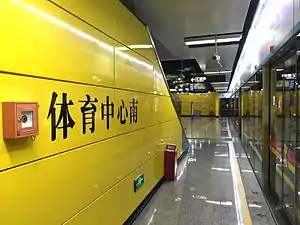 Tianhe Sports Center South Station (Chinese: 体育中心南站; pinyin: Tǐyù Zhōngxīn Nán Zhàn; Jyutping: tai2juk6 zung1sam1 naam4 zaam6) is a metro station on the Guangzhou Metro APM line. It is located below the entrance to the Tianhe Sports Center (天河体育中心) in Tianhe Road (天河路) in the Tianhe District, 200 metres (660 ft) from Tianhe Sports Center station on Line 1 of the metro.[1] It started operation on 8 November 2010.[2][3]